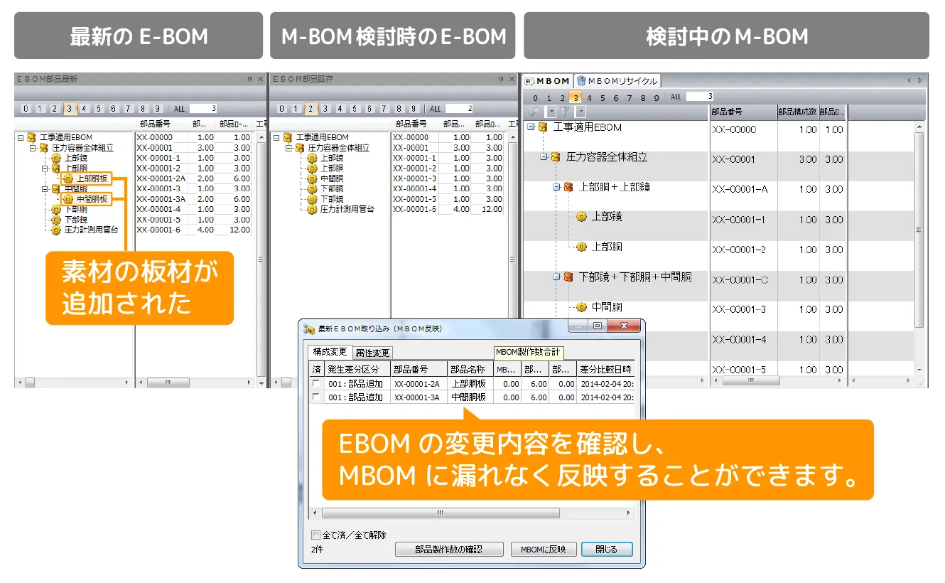 MPPCreatorは、最新E-BOMとの差分検知でM-BOMへの影響範囲を可視化し、設計変更の影響を効率的に特定できます 。