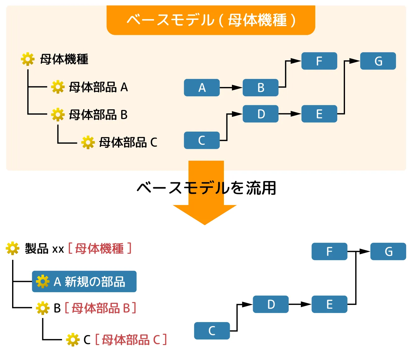 近年、顧客ニーズの多様化に伴い、多品種少量や個別受注生産が増えています。その現場では、類似機種でもM-BOMやBOPを初めから作り直す必要があり、手作業による非効率や記載ミスが発生する課題がありました。MPPCreatorでは、標準的な部品構成や工程情報を「ベースモデル(母体機種)」として登録し、M-BOMとBOPの両方で流用できます。新機種の設計時にはベースモデルを呼び出して必要部分のみを修正することで、効率的かつ精度の高い工程設計が可能になります。その結果、作業効率の向上、品質の安定化、設計と製造部門の連携強化が実現します。