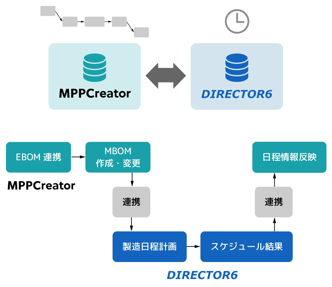 MPPCreatorは、個別受注生産向けの業界トップクラスの生産スケジューラ『DIRECTOR6』とシームレスに連携し、製造日程計画を効率的に立案することができます。MPPCreatorで設計されたプロセス情報を基に、作業指示を最適化し、日程や資源の制約を考慮した計画の作成が可能です。